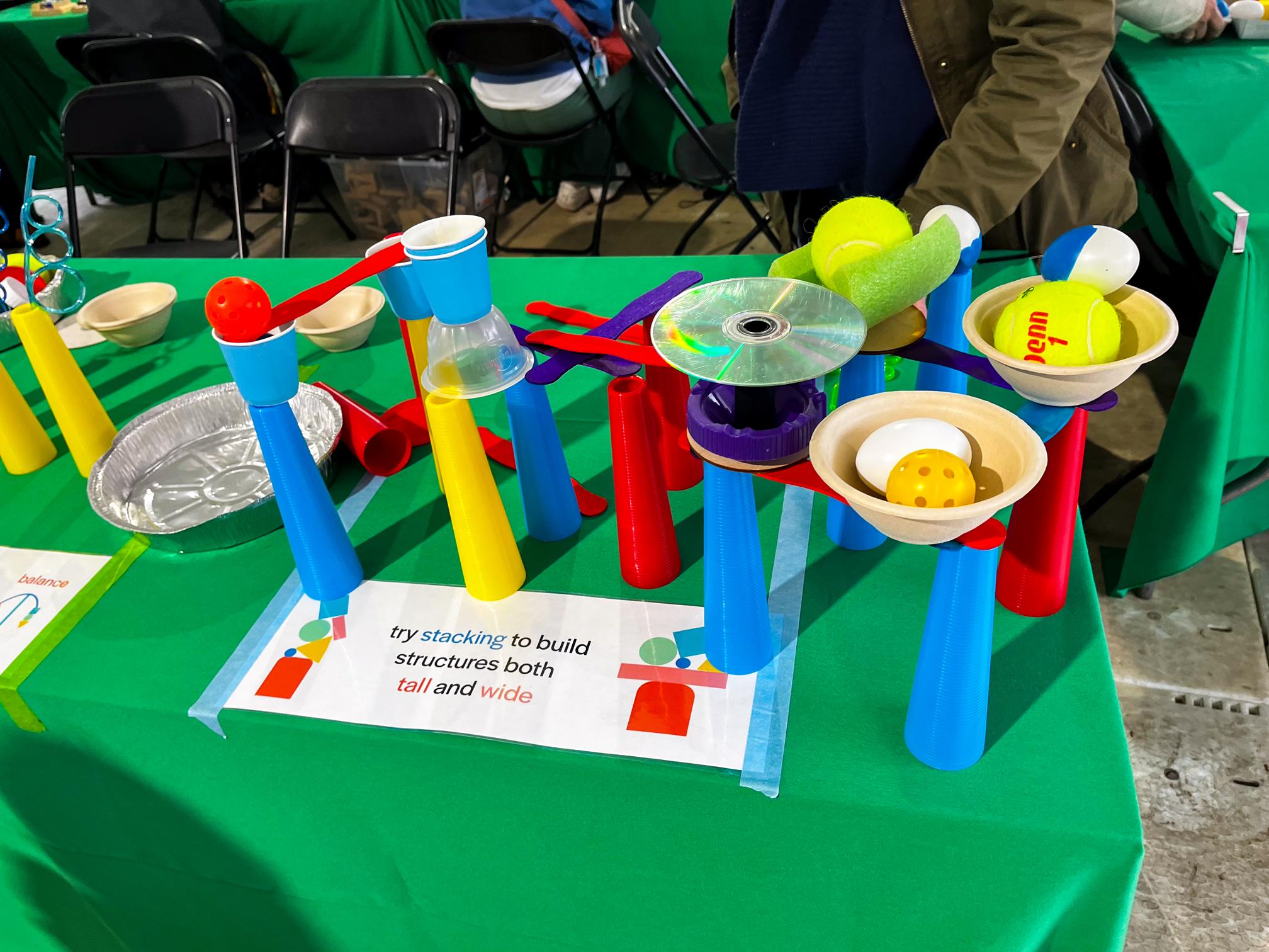 Visitors use different recycled and everyday materials to create balancing sculptures and develop problem solving skills as they modify their creations.