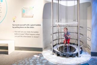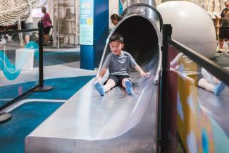 - dream machine climber + slide: Slide, crawl, scamper, and climb up and down the three-story, cloud-inspired structure. The climber and slide is recommended for ages 5 and up. Climbers can enter and exit on the exhibit level floor only. Wheelchair access to the slide is available on the lobby level, please ask an associate for assistance.