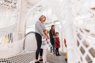Test your balance, strength, and agility in the entire Dream Machine area. Children ages 5 and up can climb into the clouds in the three-story climber and slide! The Dream Machine area is wheelchair accessible at multiple points.