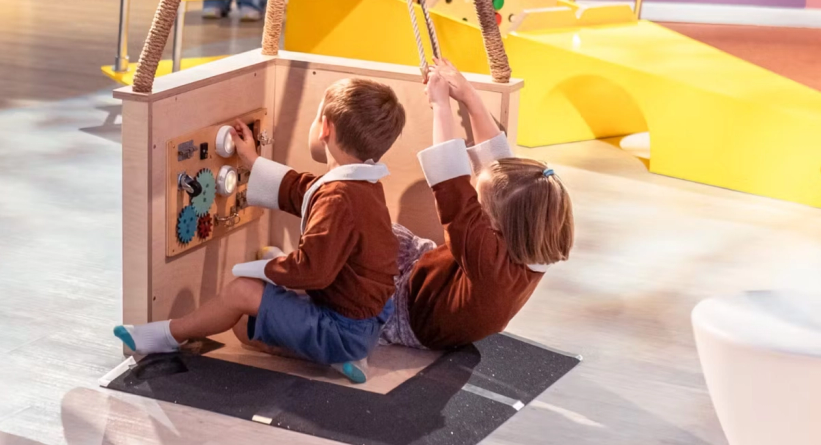 A protected cloud- and flight-themed area for infants and toddlers.